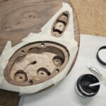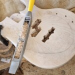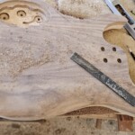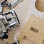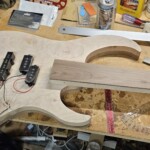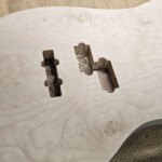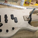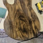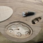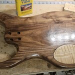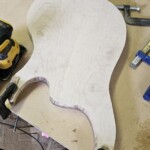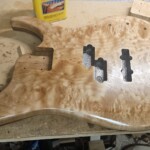 The body was the other half of the big project.Β  The overall shape was straightforward.Β  I made router templates for inletting for the base of the neck, the pickup (pup) cavities and the electronics cavity on the back.Β  Not easy and stressful cutting into the body, but it went pretty well.Β  There were a couple small errors that I had to clean up, a little creatively, but no one needs to know!Β  I drilled out routes for the wires and excavated a position for the jack.