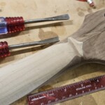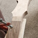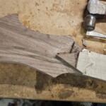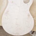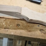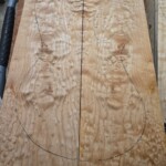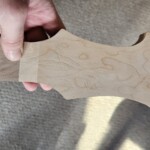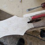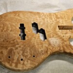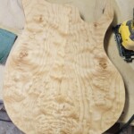 I began the build with the body.Β  I found a great set of book-matched heavily figured maple for the top.Β  It wasn’t quite thick enough for the entire body, so I decided to make the back of the body walnut.Β  I got the walnut pieces from Home Depot, so they were already dimensioned. The body that came with the kit was a little small and boring.Β  I made it bigger, a bit asymmetrical at the end and with longer and more strongly curved horns.