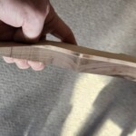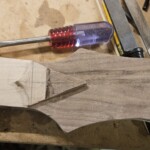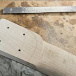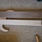 Since the body had the front maple and the back walnut, I made the neck back figured (tiger) maple and the fingerboard walnut.Β  The back piece was a nice tiger-stripe piece, also from Home Depot.Β  I had some concern about the right wood for the fingerboard… they are often made of something really hard like rosewood or ebony.Β  But on a fretted instrument hardness isn’t quit as big a concern, and walnut is used really often.