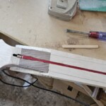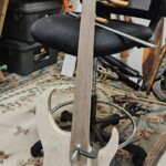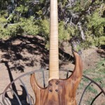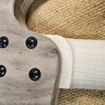 I decided to use only 22 frets instead of the common 24 (few people use those upper frets anyway).Β  This shortened the neck about an inch on what was already a long guitar, and displaced the bridge a little farther to allow more space for the pups and a place to play the strings.Β  The neck was bolted on.Β  It required a lot of shaping to make the curvature in the back and shape the headstock, etc.Β  I put in a decorative volute at the bend of the neck at the headstock.Β  I also made ¼” maple dowel for the fretboard dots.Β  The dots on the side of the neck I made from 1/8” aluminum rod.