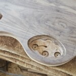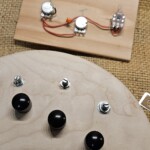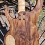 I had to learn all about wiring and routing.Β  I mounted the three pots and connected them to the jack and the pups from a rear access cavity.Β  The cavity cover is a piece of tiger maple recessed into the back and attached using magnets, no screws.