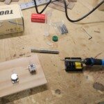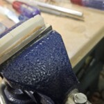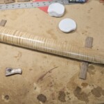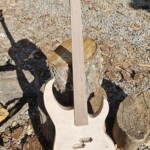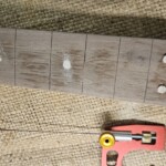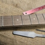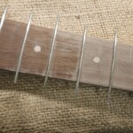 For the frets, I used Fender standard bass medium jumbo fret wire with a pre-made 9.5” radius.Β  I cut them in using a template one can generate online and mark out.Β  I used a coping saw with a slender (0.02”) blade.Β  Then I tapped them in with a small hammer using a little wood glue.Β  I filed the ends and made sure they were all together flat using fine sandpaper on an 18” level.Β  I crowned the ones that were a little high, and they came out pretty good!