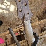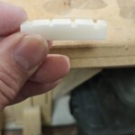 For the nut I got some bone pieces online (I think they are water buffalo from somewhere in Asia).Β  I shaped the nut using files and sanding.Β  The top is at a bit of an angle.