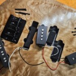 I chose to use a PJ pickup configuration.Β  This includes a precision-bass (P) set of pickups for the neck which have humbucker properties (opposite polarities in the pickups).Β  However, I put the more treble pickup closer to the neck instead of the standard configuration (reversed the usual configuration) based on some advice I found online.Β  The J (jazz) pup is pretty close to the bridge to pickup those low, jazzy tones.Β  I used Firefly pickups which are regarded as among the better of the inexpensive pups out there.