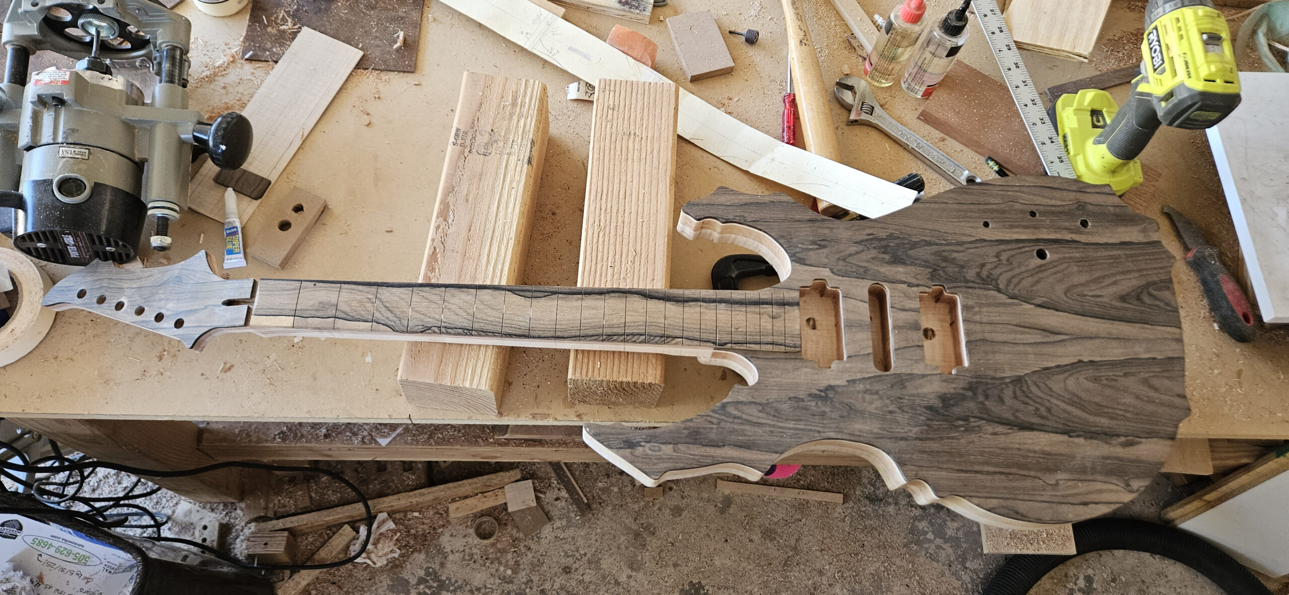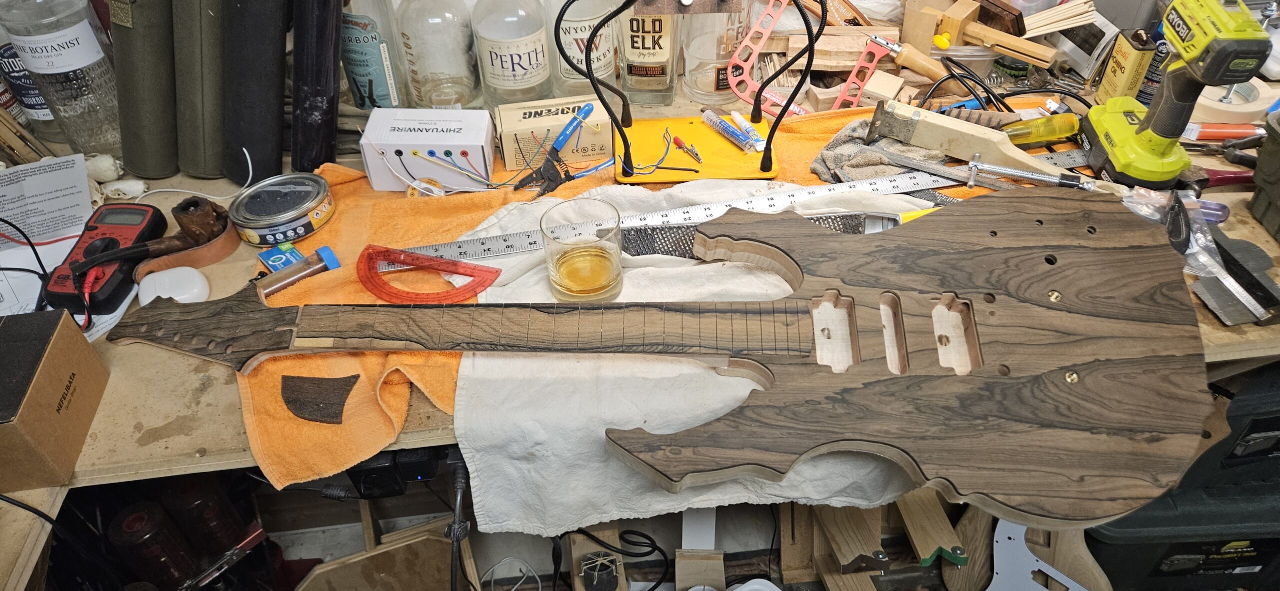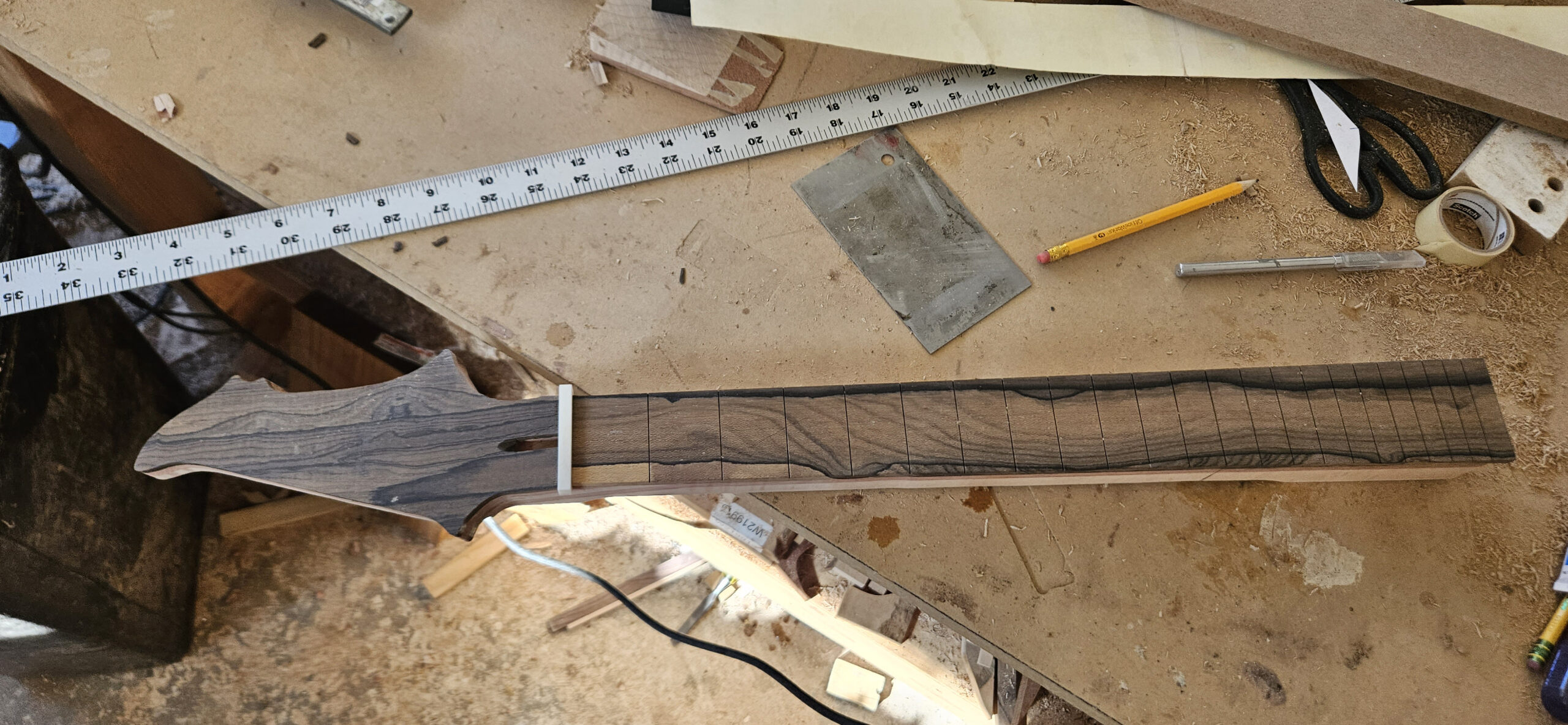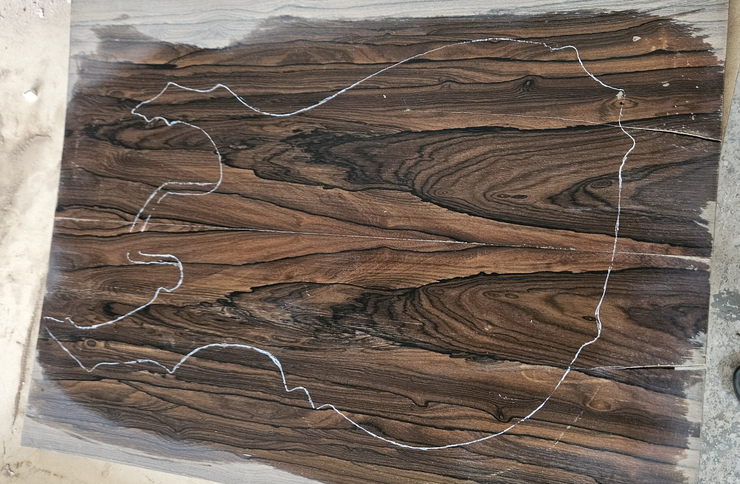 The finish is a seal of blonde shellac. The front was just finished with a combo of beeswax and carnauba wax. Oil based finishes darken ziricote too much so you can’t see the figure, so I wanted to keep it simple. I know the wax is not super hard, so there may be some challenges keeping it from getting scratched and dinged in the future. The back I treated with medium brown and golden brown TransTint to deepen the curls in the maple, but it didn’t come out as strongly marked as I’d have liked.