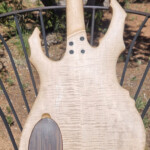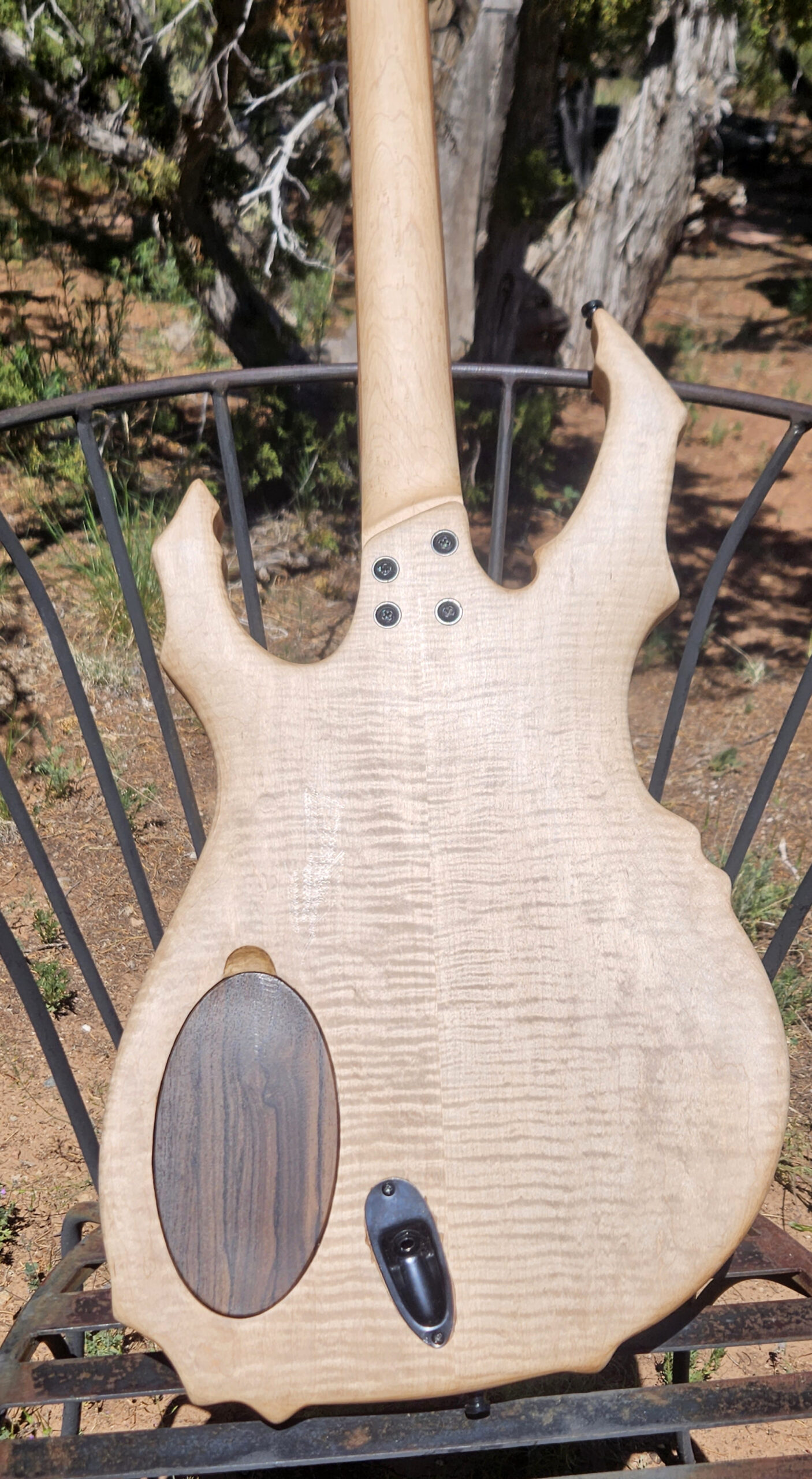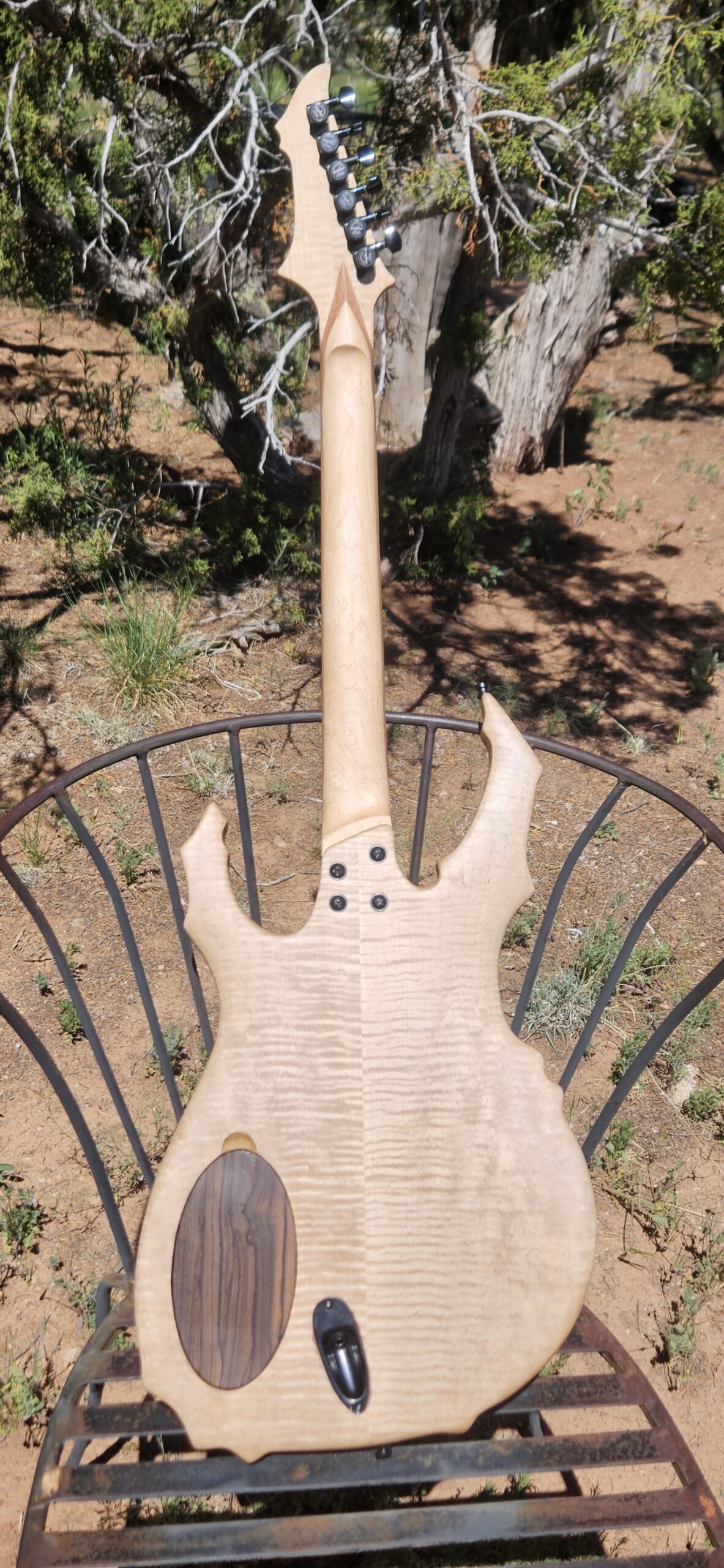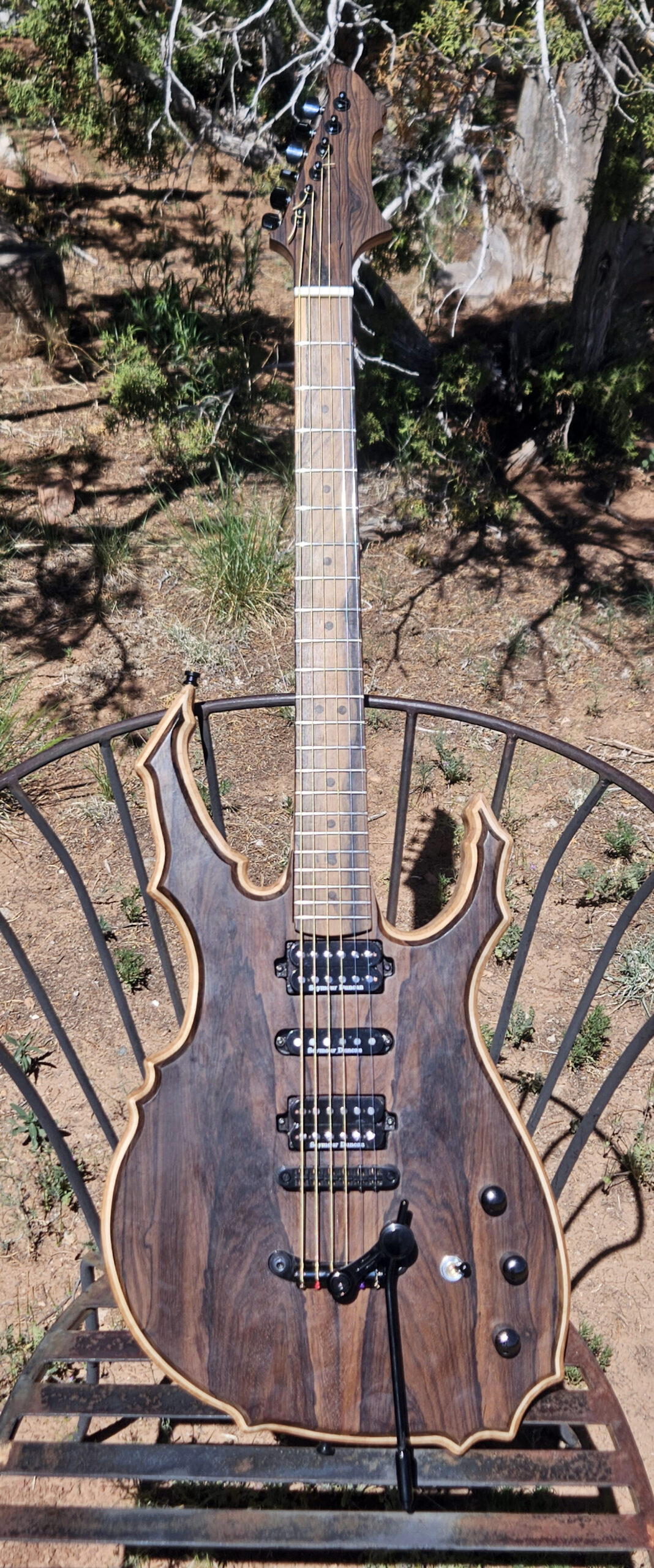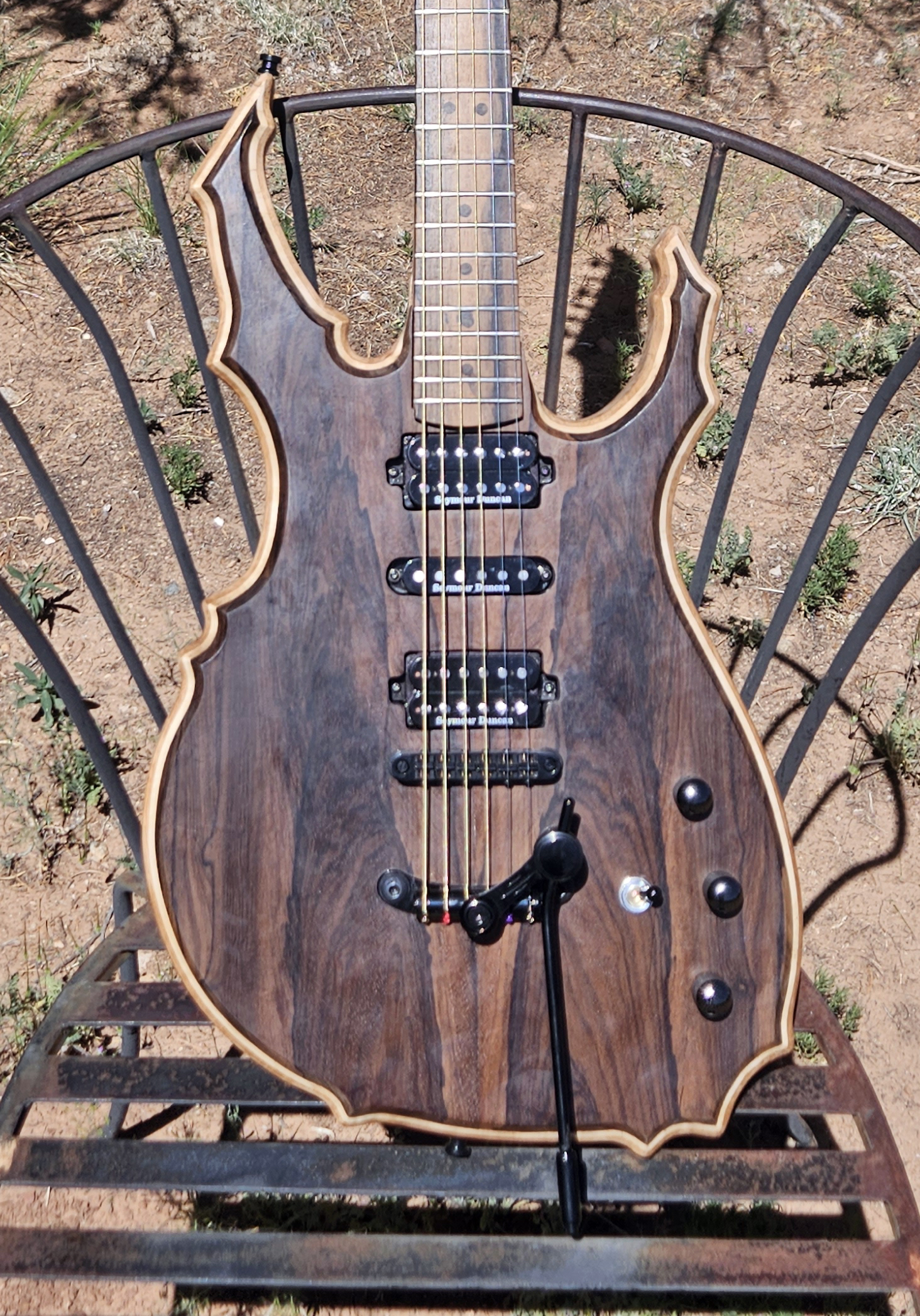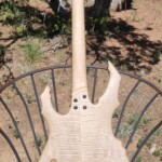 The body is book-matched ziricote on the front on top of a thin layer of maple, on top of mahogany with the back book-matched curly maple. I decided to make the shape irregular in outline. I wanted the guitar to look like it grew out of the forest. I think it ended up looking like a Lord of the Rings guitar.