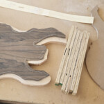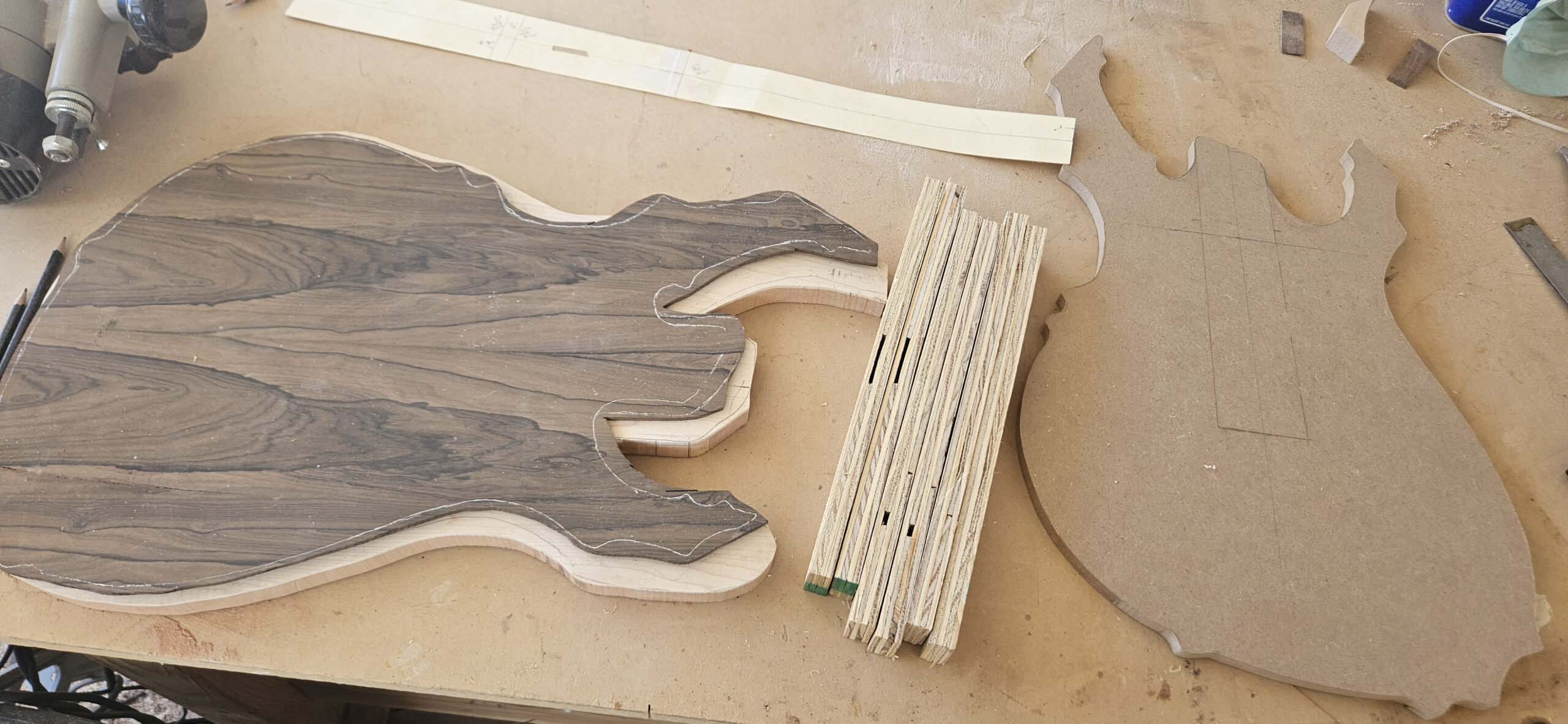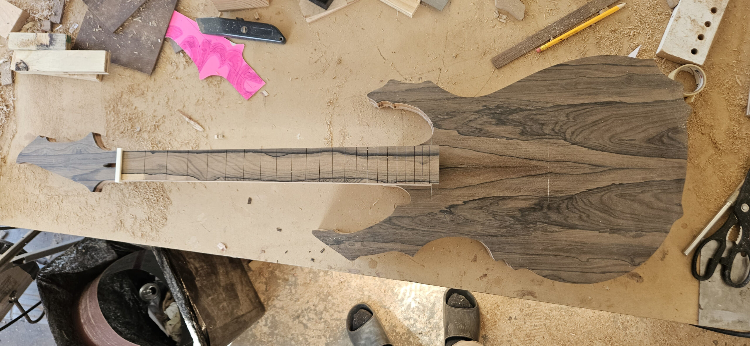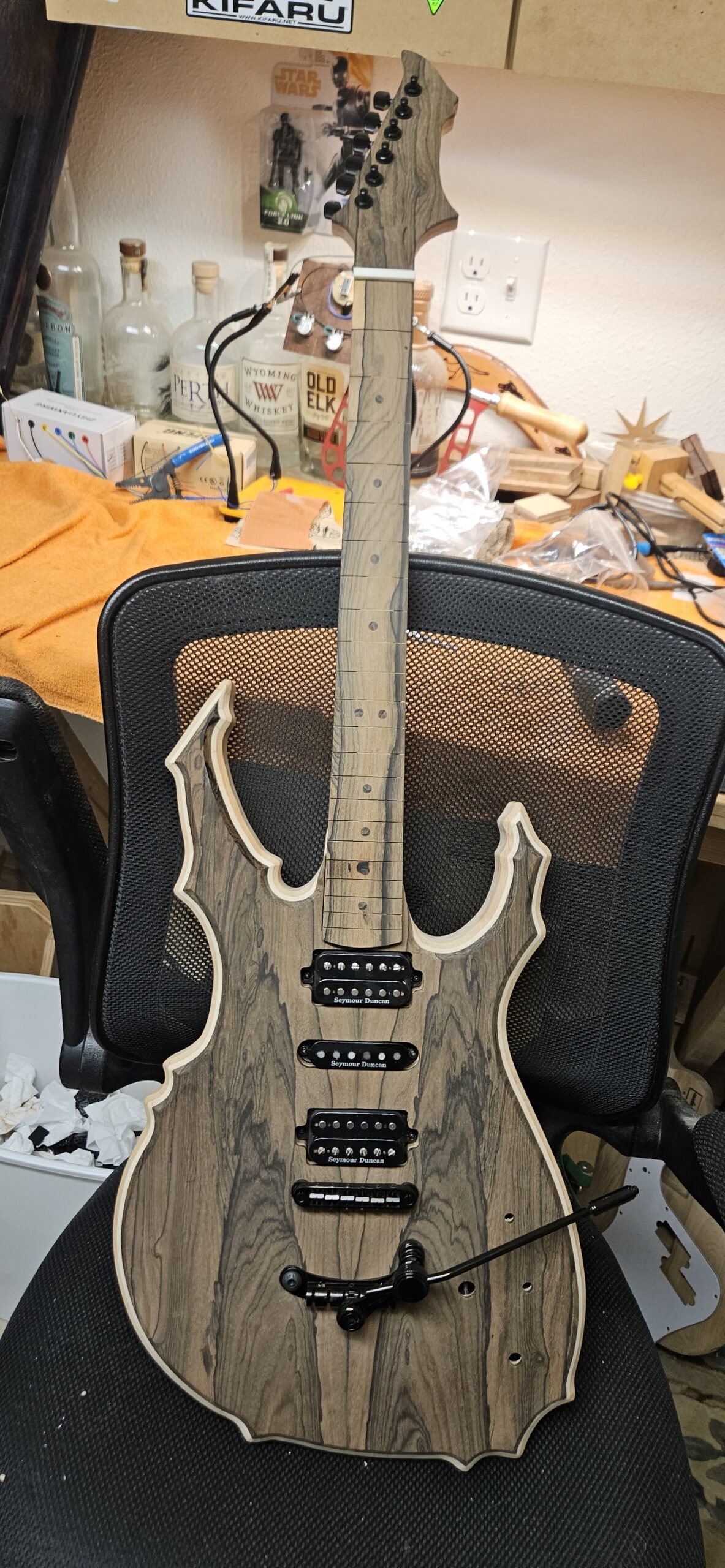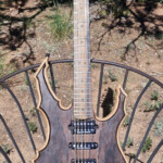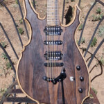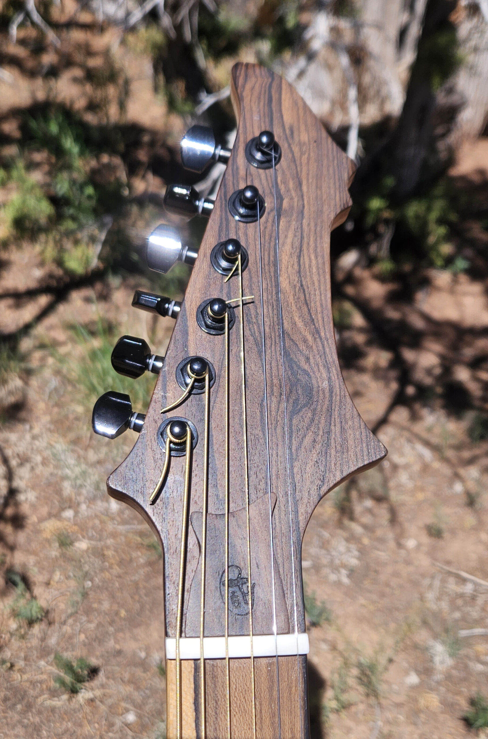 The body is book-matched ziricote on the front on top of a thin layer of maple, on top of mahogany with the back book-matched curly maple. I decided to make the shape irregular in outline. I wanted the guitar to look like it grew out of the forest. I think it ended up looking like a Lord of the Rings guitar.