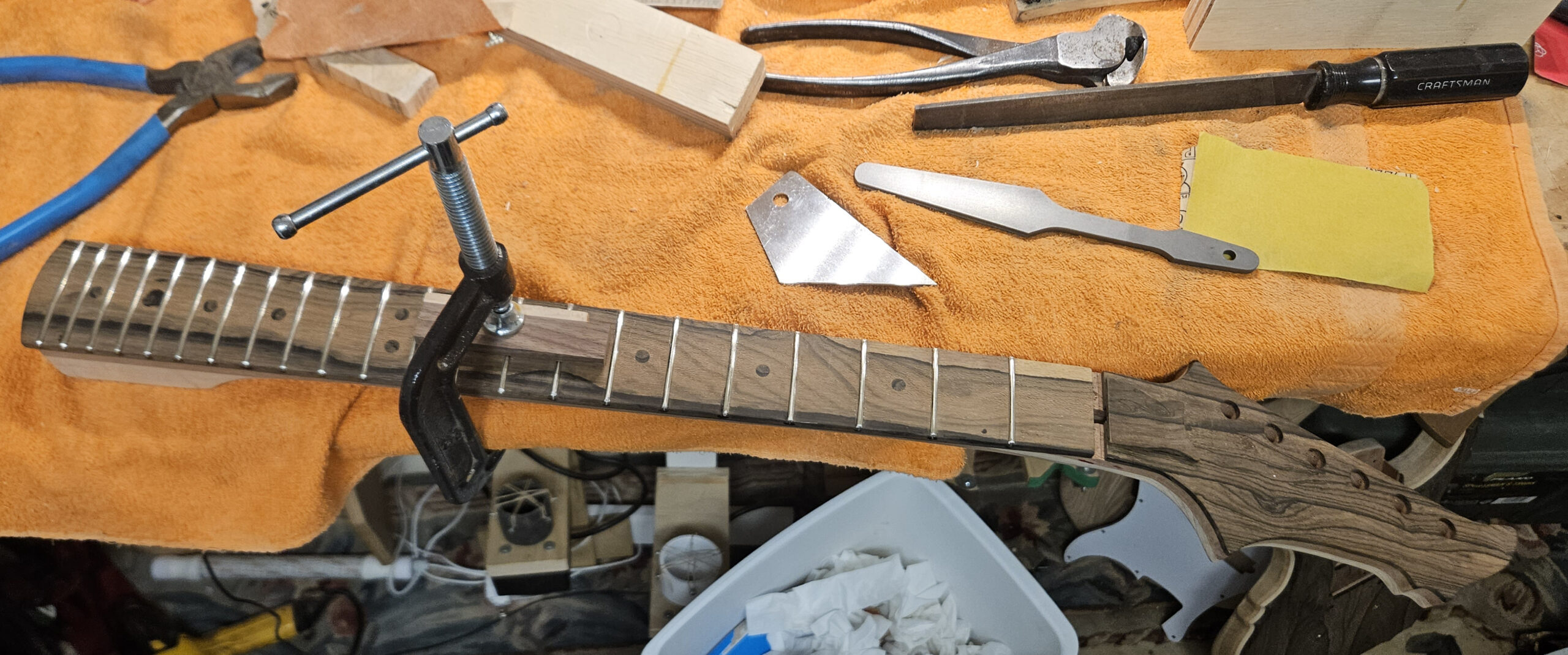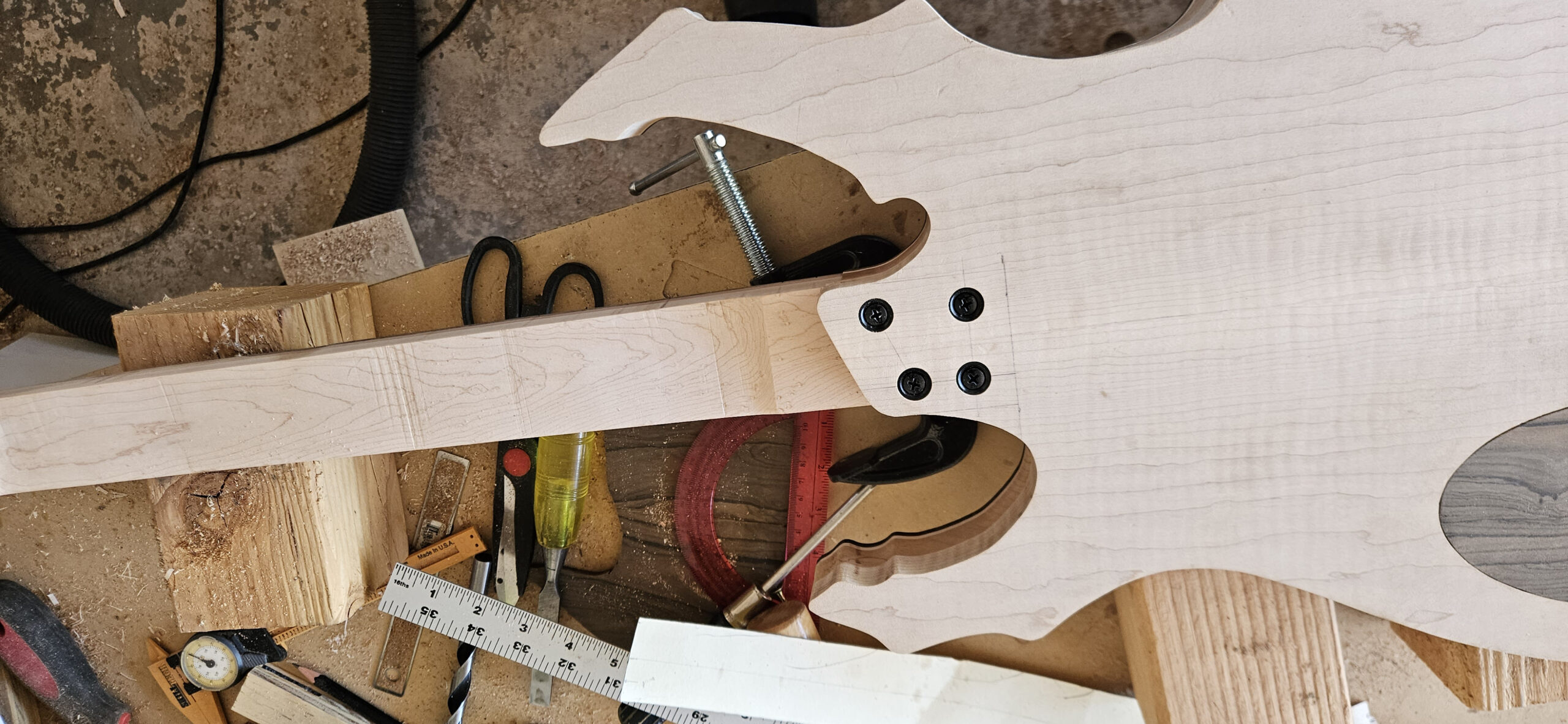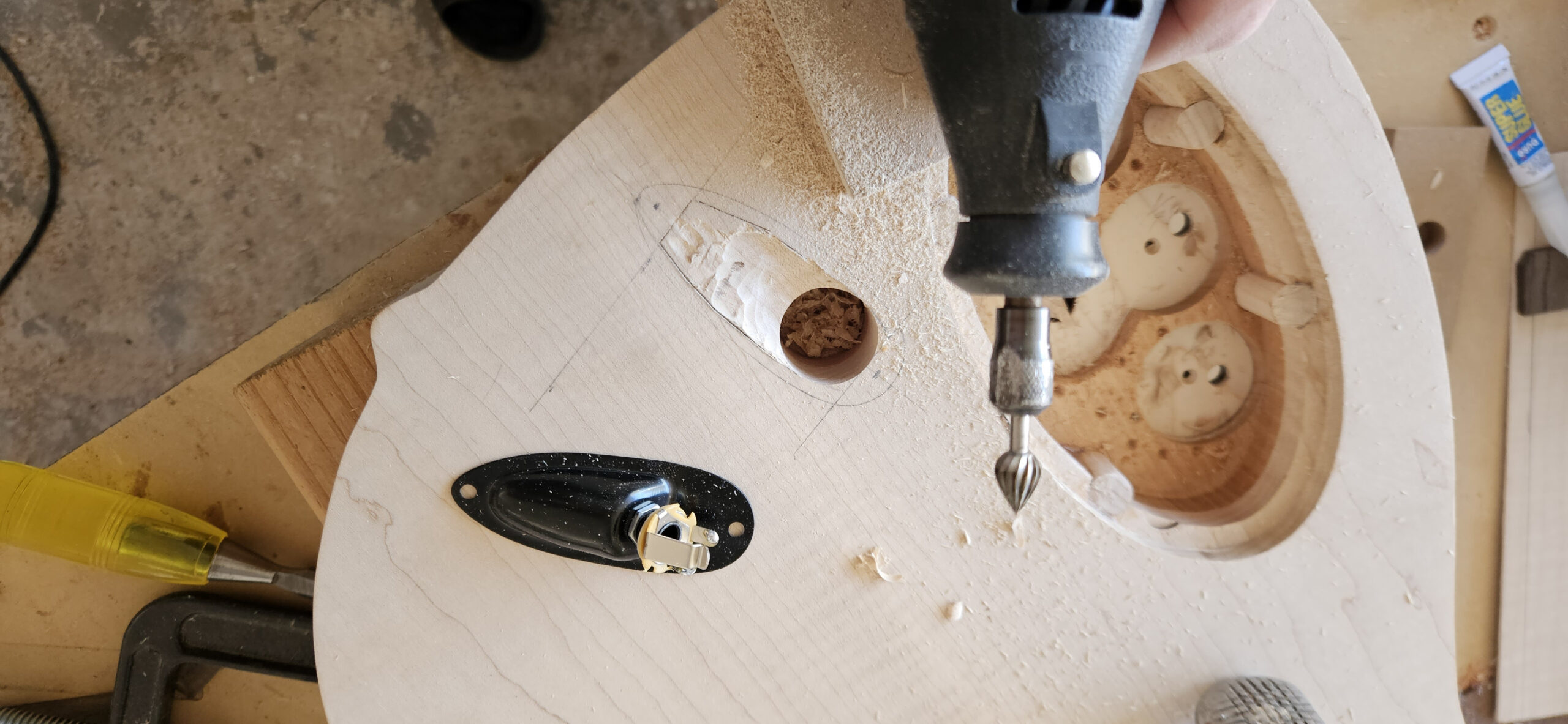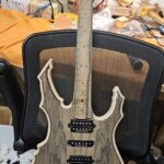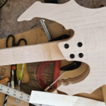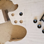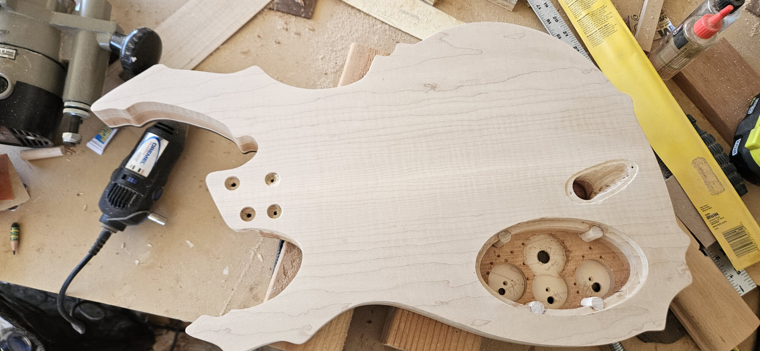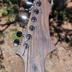 Other hardware… the tuners are Guyker Locking Tuners (1:18 ratio, 6 same side for right-hand guitar). Control knobs are Xiyangjuan black metal with a hex nut tightener. The bridge is a Gotoh GE103B-T Tune-O-Matic style with large metric stud posts. The tailpiece is a Les Trem II Vibrato Gold Tailpiece for Les Paul with a tremolo bar. The jack is a black Strat style, but on the back, like on Josey’s bass, to keep it out of the way the front wood more exposed.