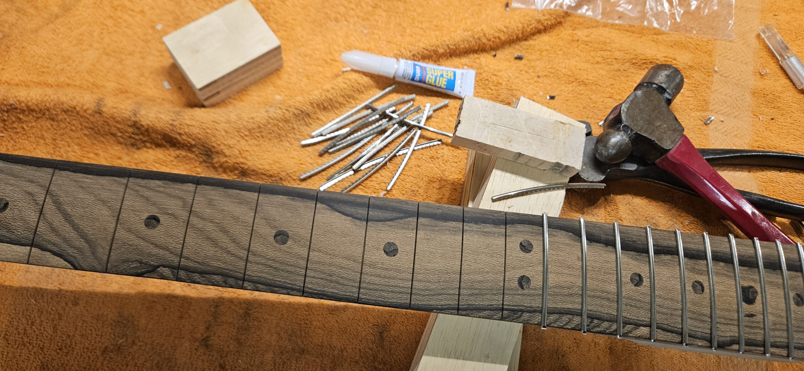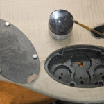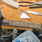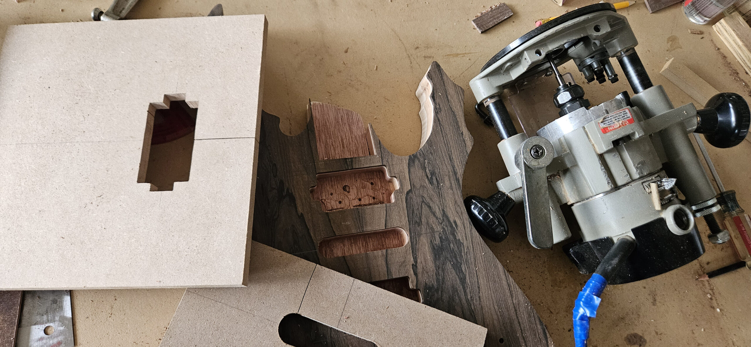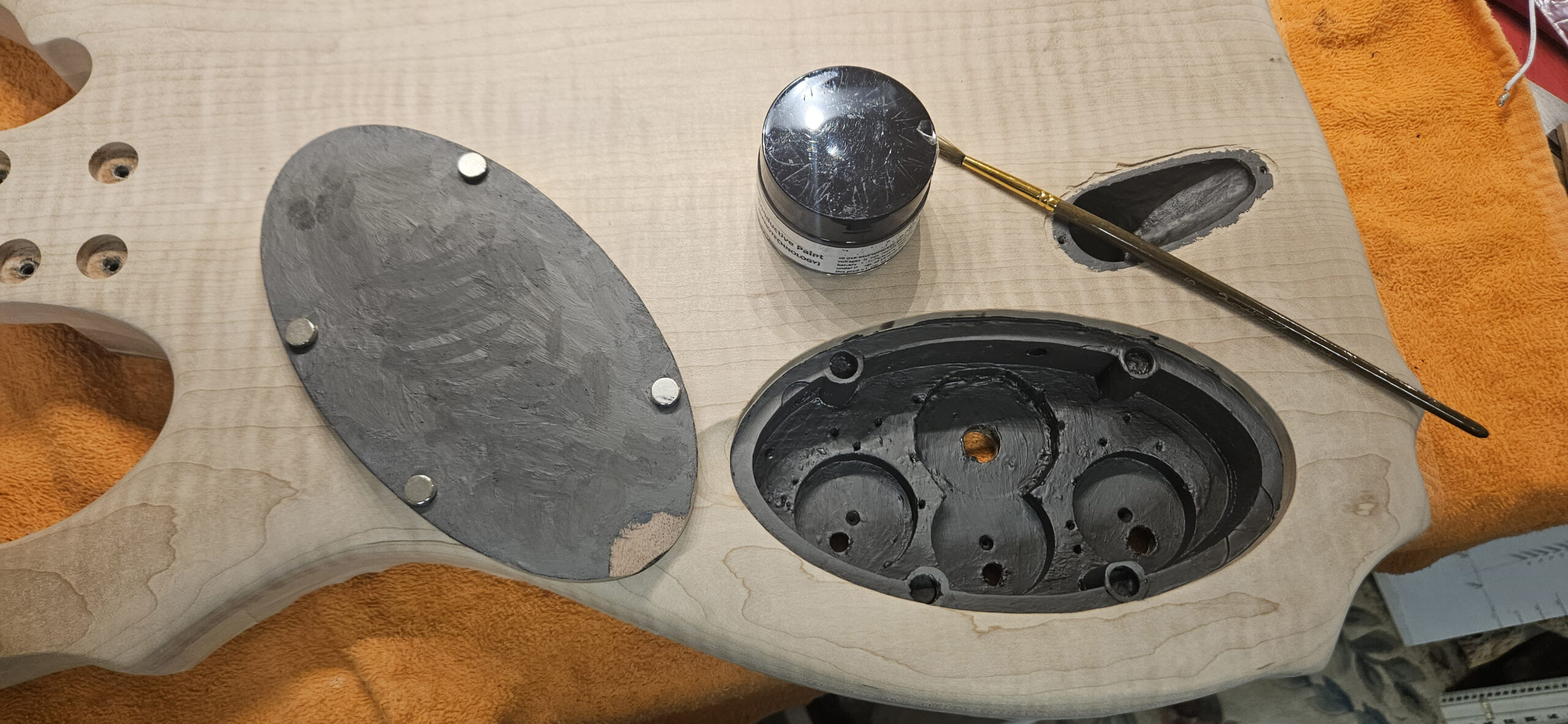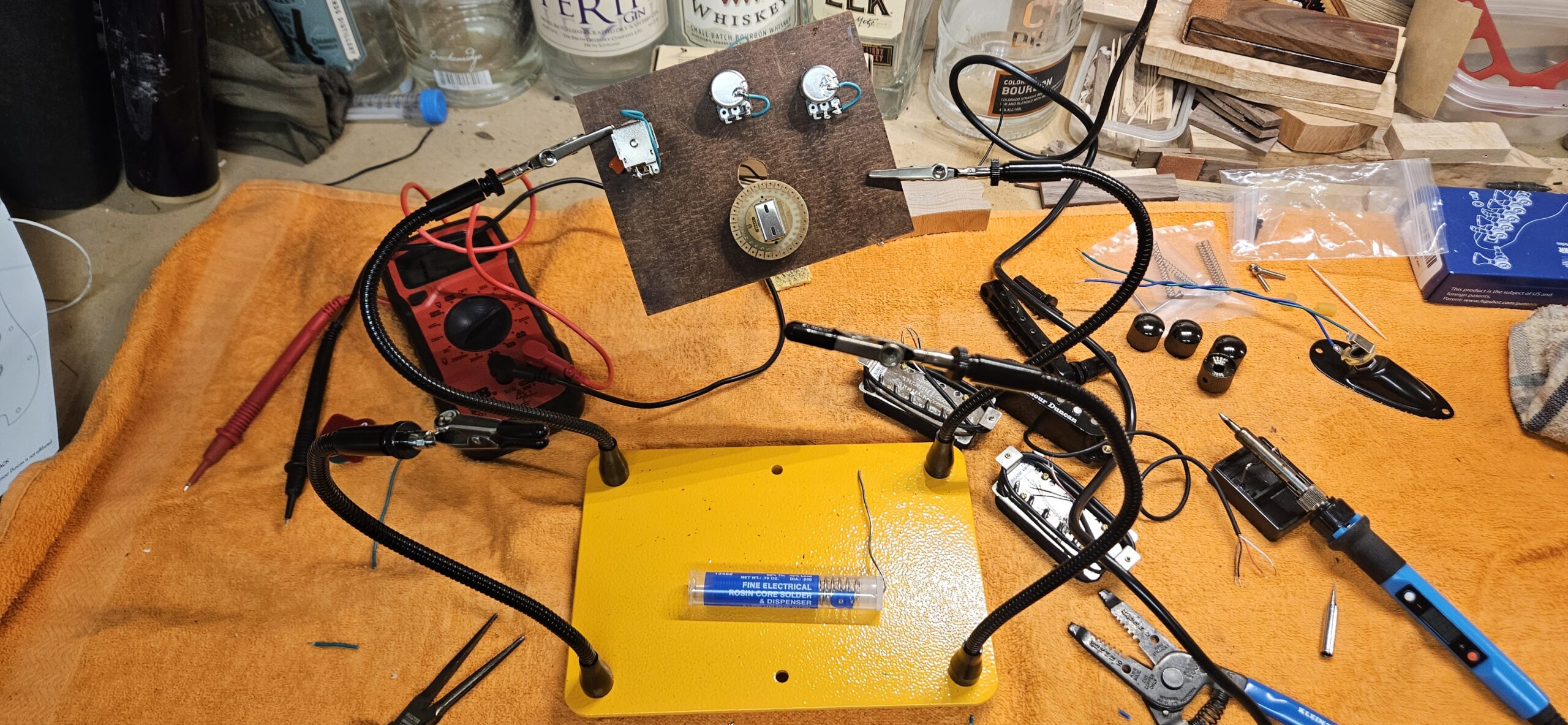 Other hardware… the tuners are Guyker Locking Tuners (1:18 ratio, 6 same side for right-hand guitar). Control knobs are Xiyangjuan black metal with a hex nut tightener. The bridge is a Gotoh GE103B-T Tune-O-Matic style with large metric stud posts. The tailpiece is a Les Trem II Vibrato Gold Tailpiece for Les Paul with a tremolo bar. The jack is a black Strat style, but on the back, like on Josey’s bass, to keep it out of the way the front wood more exposed.