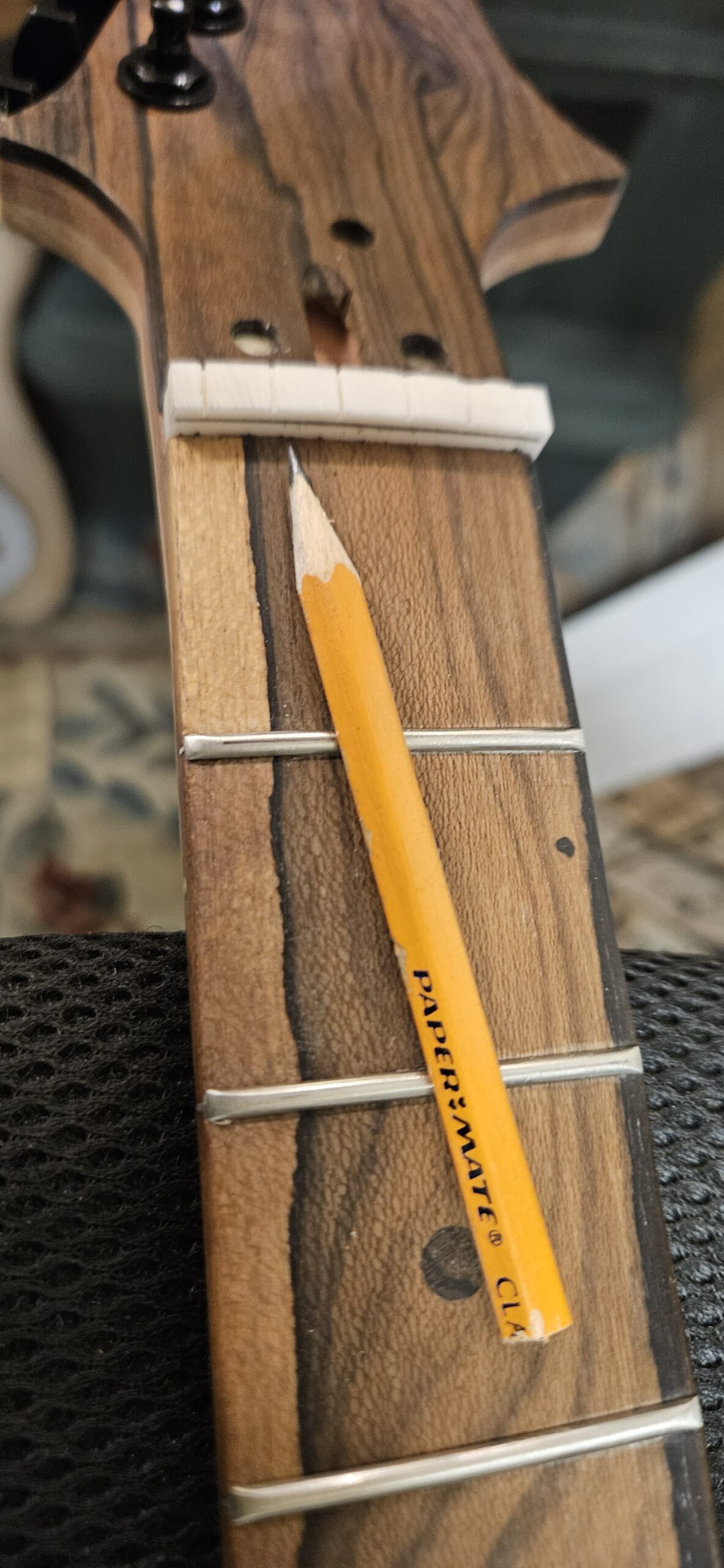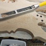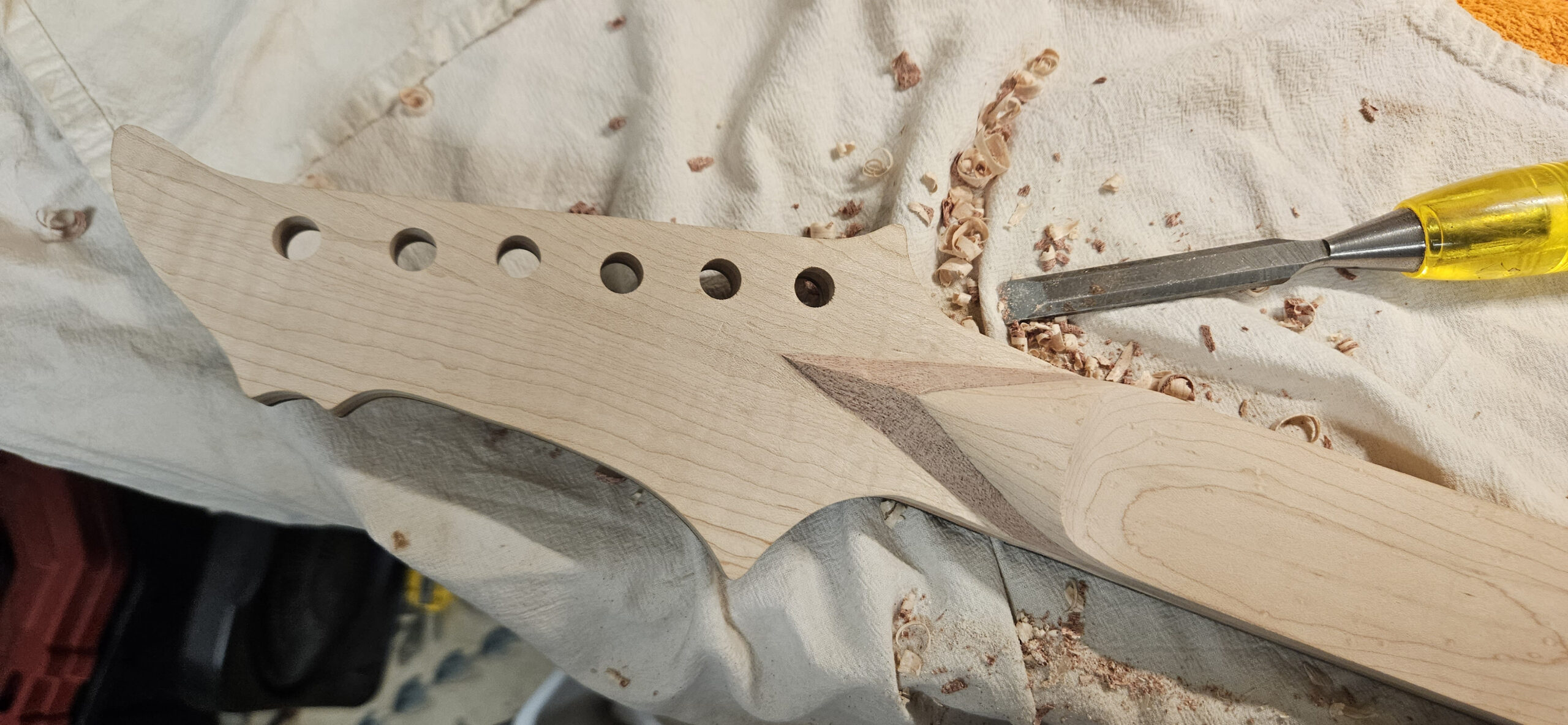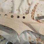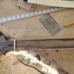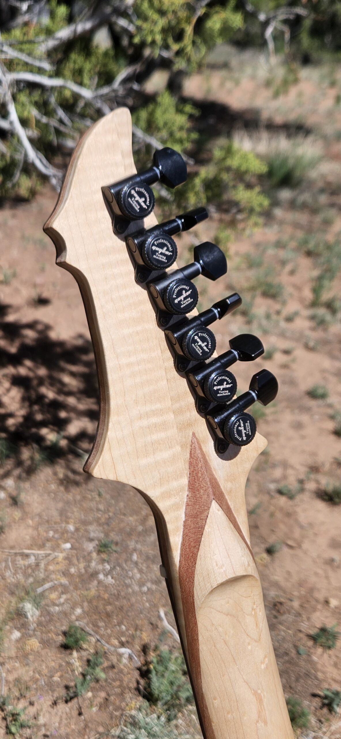 The neck is also maple, mahogany and a fretboard and headstock front made of ziricote. Not the hardest wood, but similar to maple, so hopefully it will hold up to playing. The headstock shape is my own idea. The neck has a StewMac Hot Rod Low Profile 2-Way Truss Rod, 18″ adjustable at the headstock with a cover attached with magnets. The fret dots are also ziricote from dowels I made myself. There was a small error installing one, and the fix resulted in a blotch. Oh well. The side dots are maple dowel, also that I made myself. It was fun to learn how to make my own dowels. The nut is water buffalo bone, and I built it myself. It probably still needs some work to make it right.