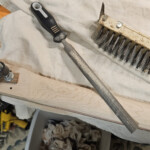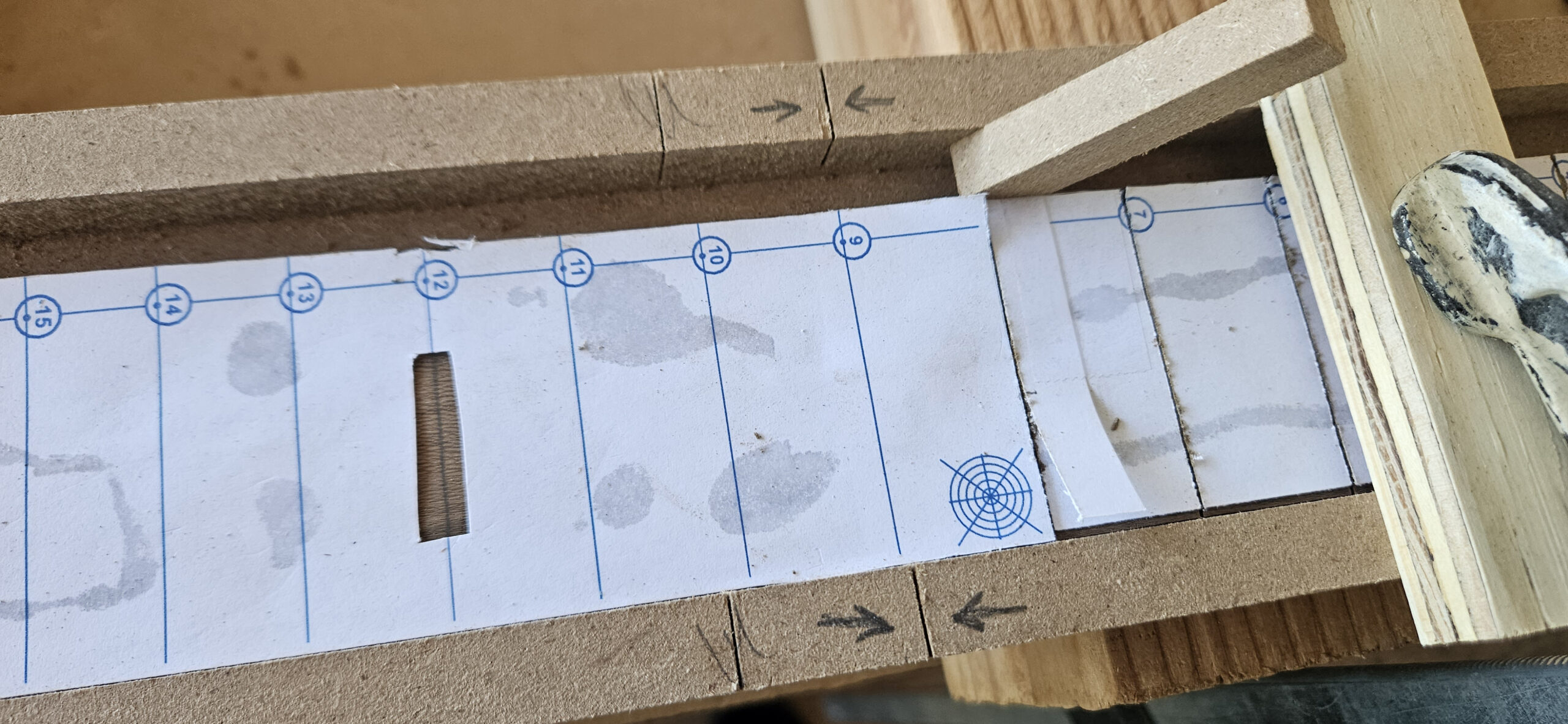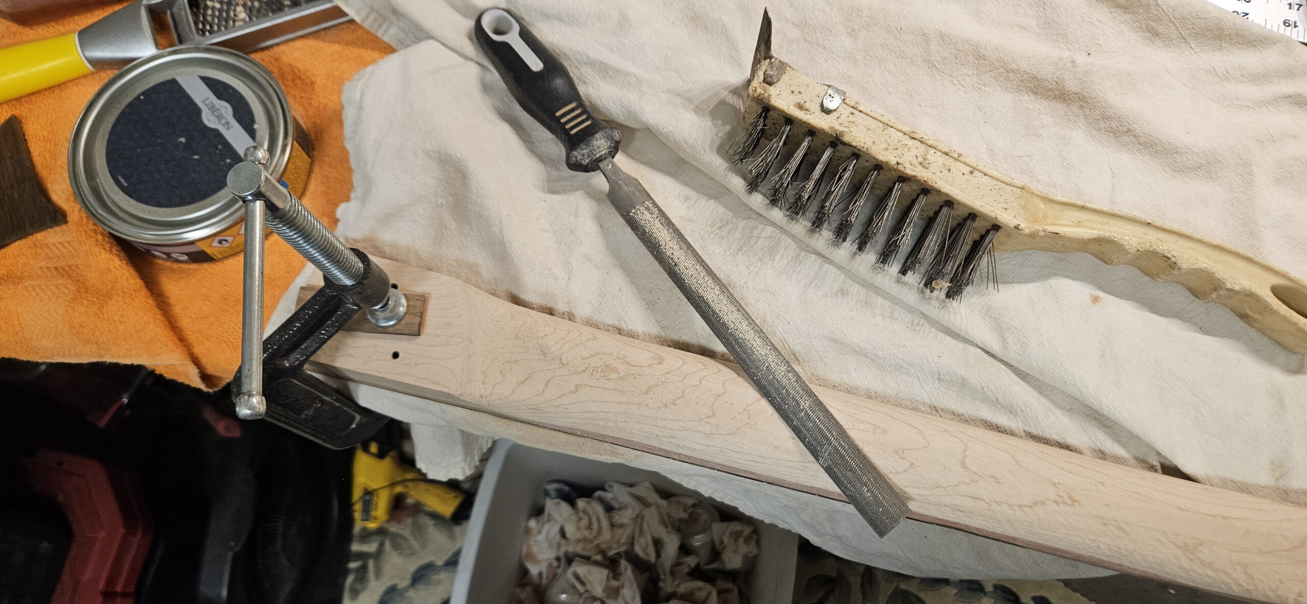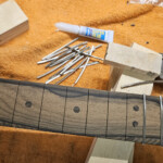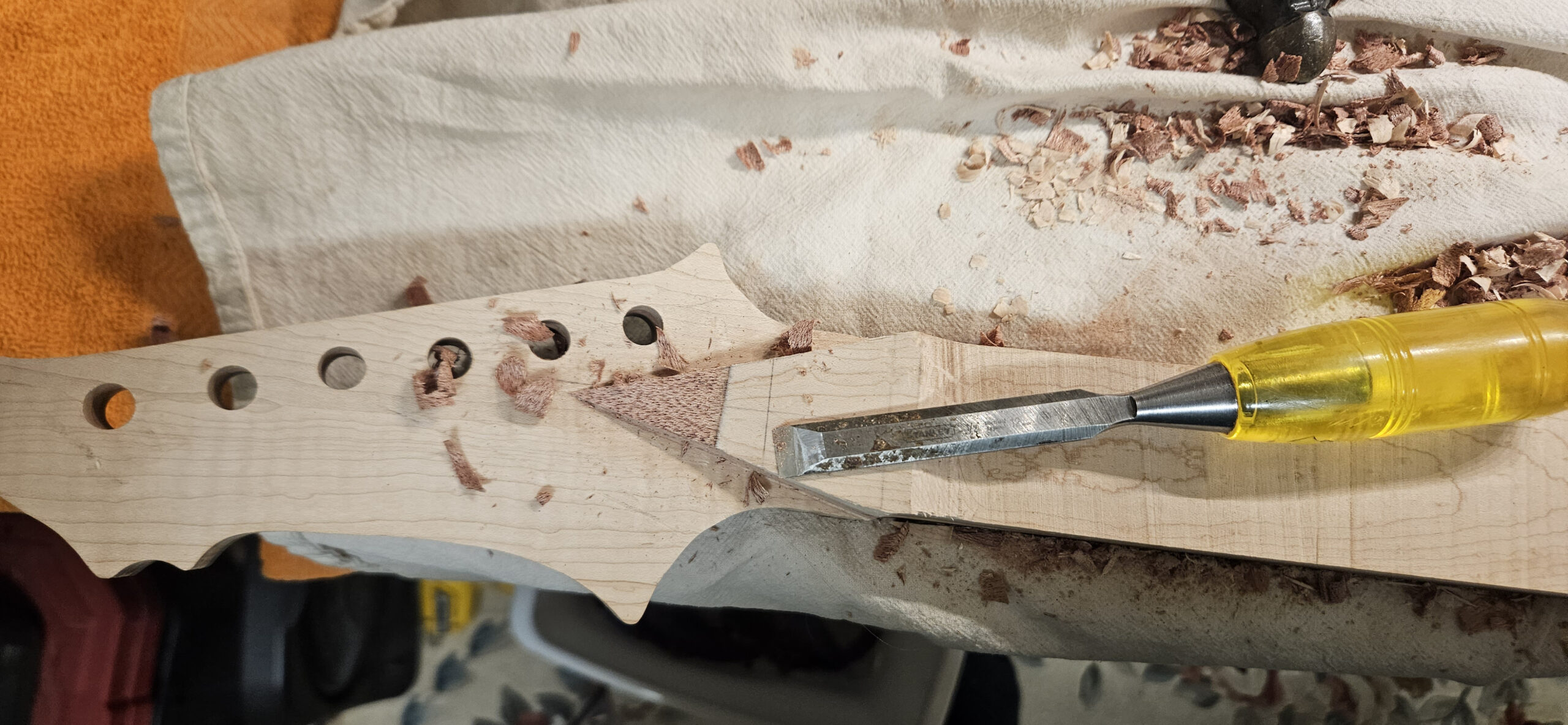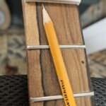 The neck is also maple, mahogany and a fretboard and headstock front made of ziricote. Not the hardest wood, but similar to maple, so hopefully it will hold up to playing. The headstock shape is my own idea. The neck has a StewMac Hot Rod Low Profile 2-Way Truss Rod, 18″ adjustable at the headstock with a cover attached with magnets. The fret dots are also ziricote from dowels I made myself. There was a small error installing one, and the fix resulted in a blotch. Oh well. The side dots are maple dowel, also that I made myself. It was fun to learn how to make my own dowels. The nut is water buffalo bone, and I built it myself. It probably still needs some work to make it right.