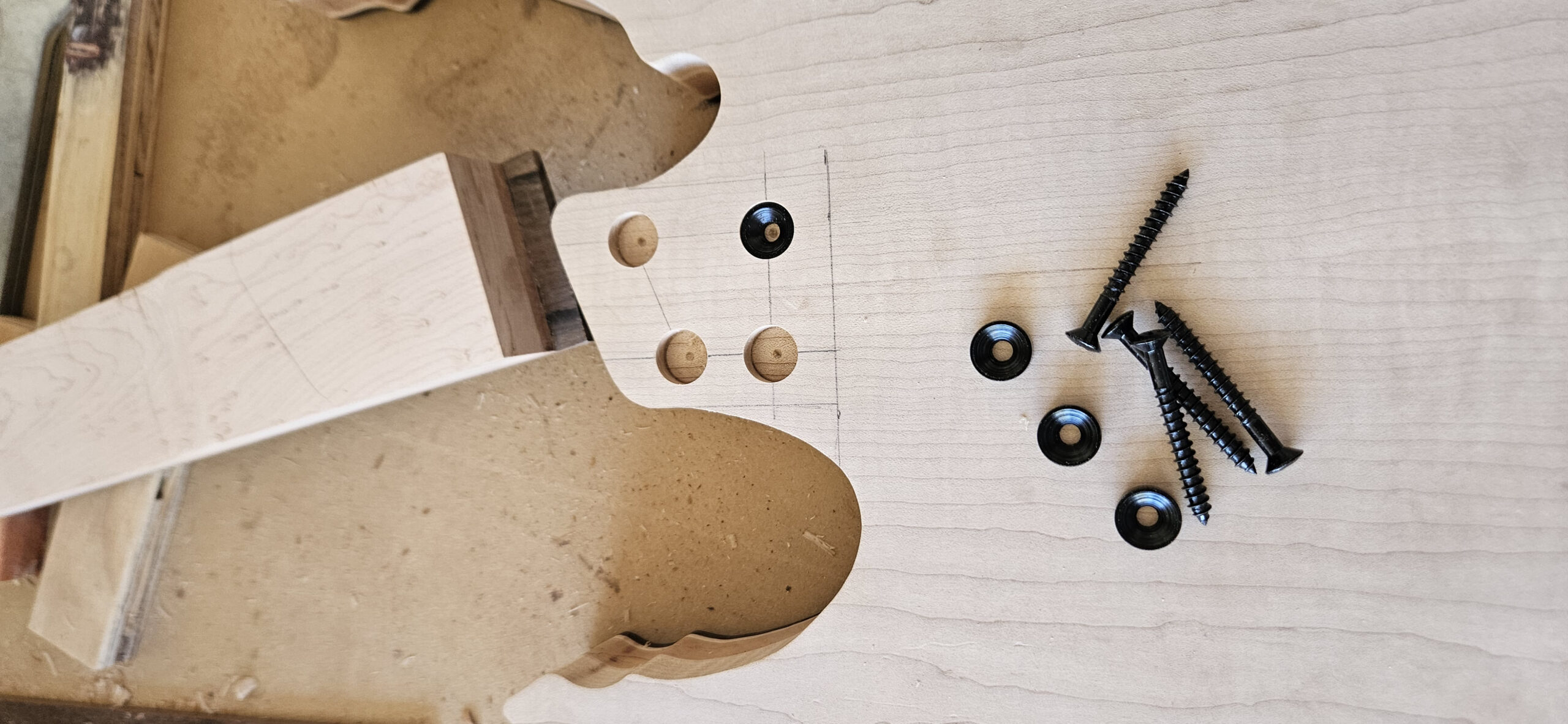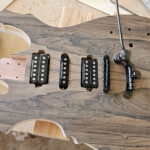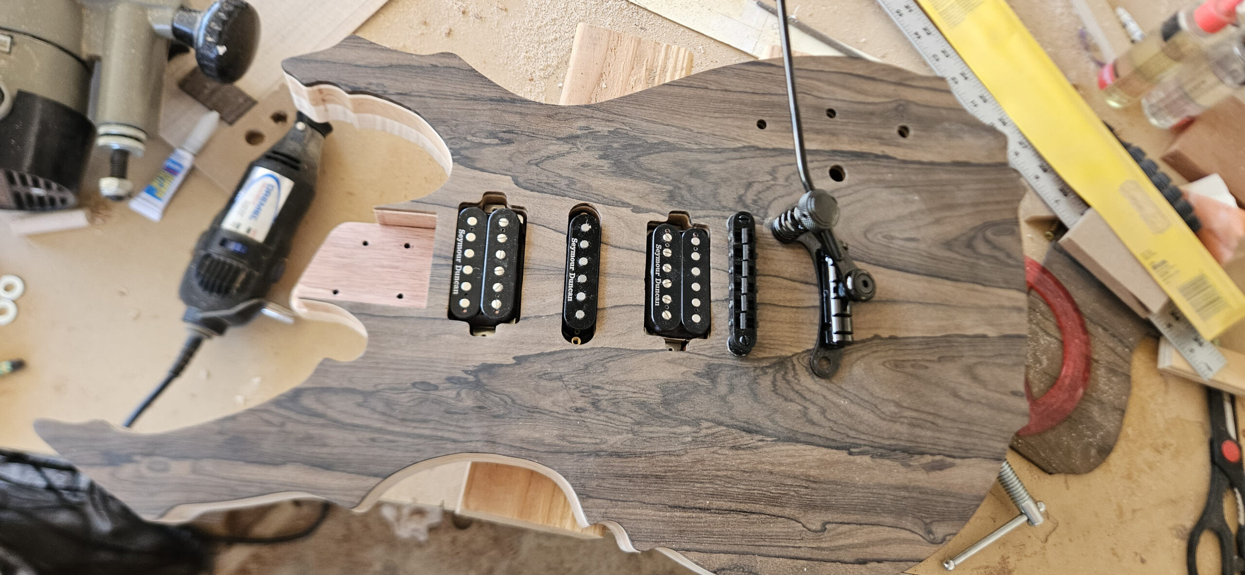 I decided to us an HSH pickup configuration (humbuckers at the bridge and neck and a stacked single coil in the middle). I attached these directly since I didn’t want a pickguard or even pup rings to obscure the wood. I used Seymour-Duncan HS4 humbucker (bridge), STK-S4M (middle), and SH-2N humbucker (neck).