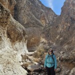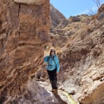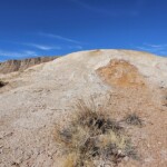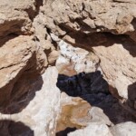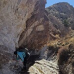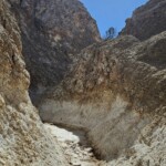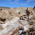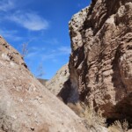 Around the corner from the Gypsum Gorge is a Gypsum Slot Canyon that we have visited once before. It’s the only slot canyon we know of made of gypsum. We attempted to approach the slot from the bottom, but the arroyo below it was shockingly choked with dense piles of tumbleweeds. The carcasses of these evil plants were 10-15 feet deep in places. We were able to get around them for the most part, but then one place required us to scale the dirt sides of the arroyo, and as I tried to move along the sides, I fell in! I’m pretty allergic to these things, and as I was stabbed by the stupid little barbs on these heinous fiends I started to swell up in a rash. I had to clamber out of the arroyo, with Riki’s help, and we scaled the side of the arroyo and out. We gave up at that point. I hope some major rains flood the bottom of these arroyos so we can be rid of the tumbleweeds!